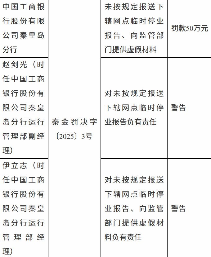 1月20日,国家金融监督管理总局秦皇岛监管分局行政处罚信息公开表显示,中国工商银行股份有限公司秦皇岛分行因未按规定报送下辖网点临时停业报告、向监管部门提供虚假材料被罚款50万元。责任人赵某光、伊某志被警告。