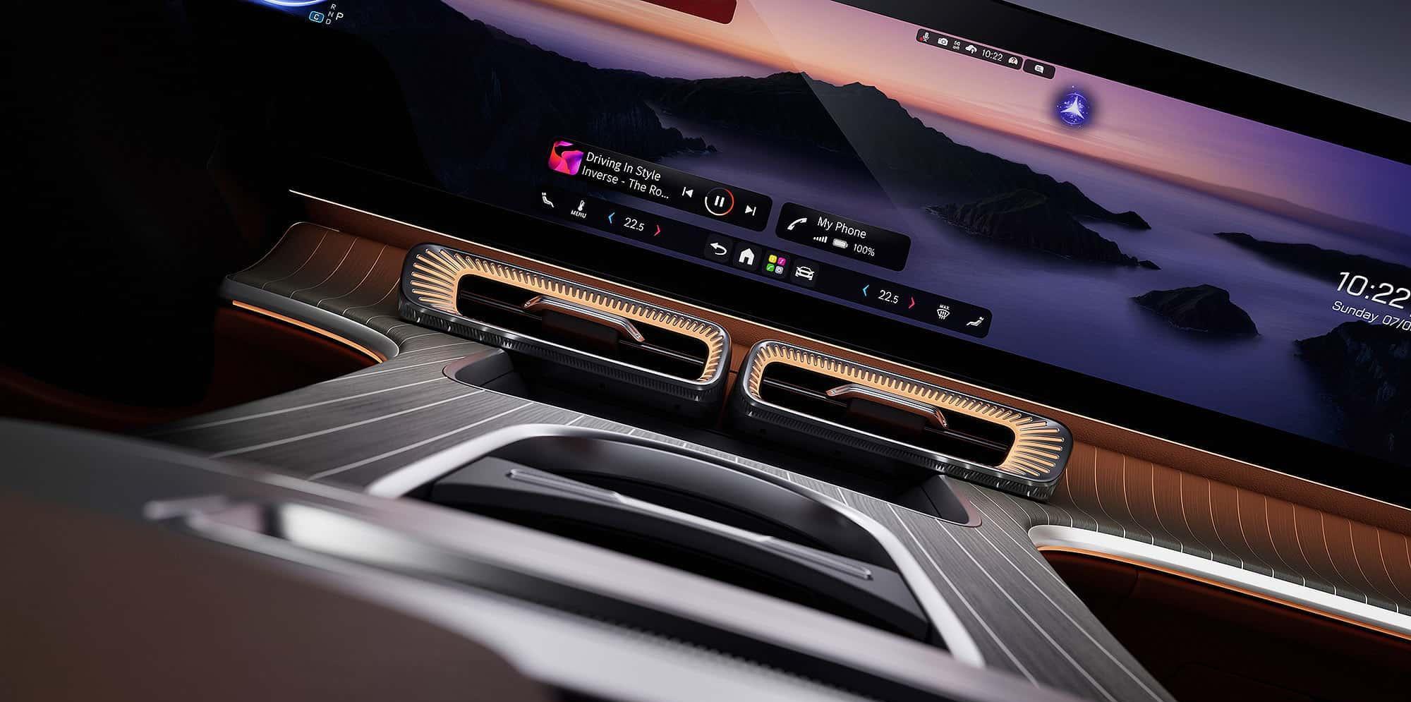 可选装的MBUX Hyperscreen超联屏,几乎覆盖整个仪表台,尺寸达到99.3厘米,是迄今为止奔驰原厂安装的最大屏幕。凭借超高分辨率和矩阵背光技术(超过1000颗独立LED),显示效果极其锐利。